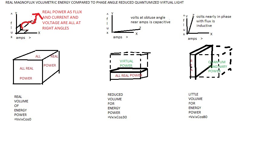 Fundamental Electromagnetic Energy Power is massless and contains an area of spinning magnoflux inertia which is attracted forward through space by a voltage. If the voltage is not at right angles a Cosine reduction in real energy occurs and Quantum energy is produced in a similar way to the production of low frequency 50 or 60 cycles per second AC power in a 3 phase generator.