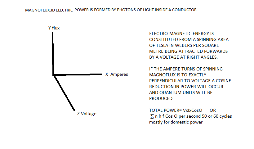 Thus the photon area x,y is measured in Tesla/m^2 but magnoflux is spinning Tesla as per Maxwell’s corkscrew rule with the formula 2ПhfCosine Ф where h is Planck constant and f frequency in cycles/second Hz but to spot the instantaneous sync point of the rotating flux it needs a further 0 to360 degree angle Ф unit at dt to be added to the formula.